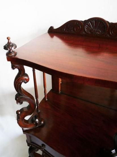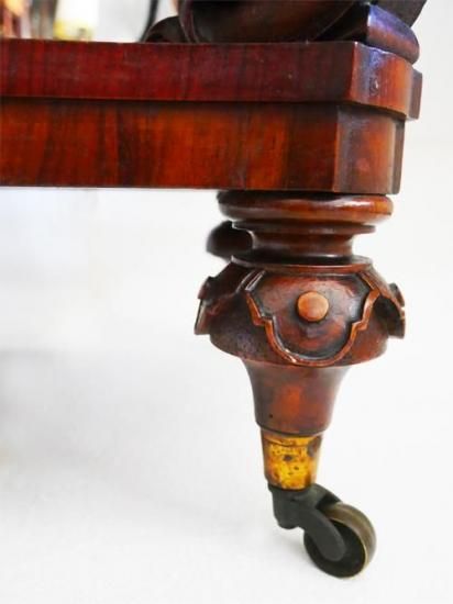 背板があることで強度を保ちつつ、ミラー効果でワットノットの軽やかな印象はそのままに、というとても贅沢な仕様。表情豊かな深い杢目を持つ天板、前面は複数の曲線でできたサーペンタインシェイプ、サイドに並ぶ支柱は挽物で、手前のメインの支柱はアカンサスのスクロール。トップの擬宝珠も複雑な彫を施した凝ったもので、すべてに最高級の仕上りを求めた逸品となっています。一段ではございますが引き出しもあるので、ミュージックキャビネットのような使い方をしていたのかもしれません。