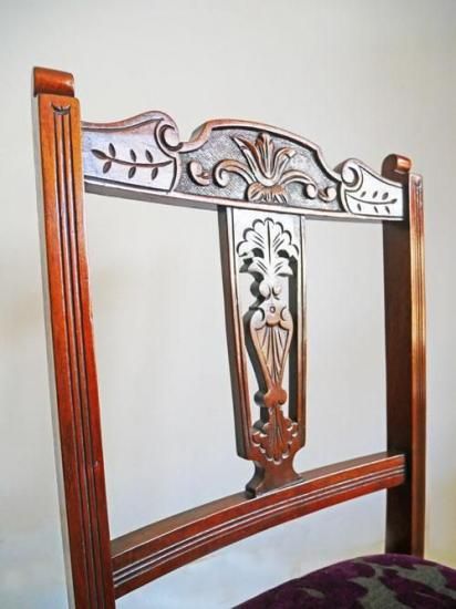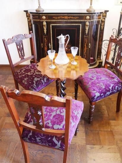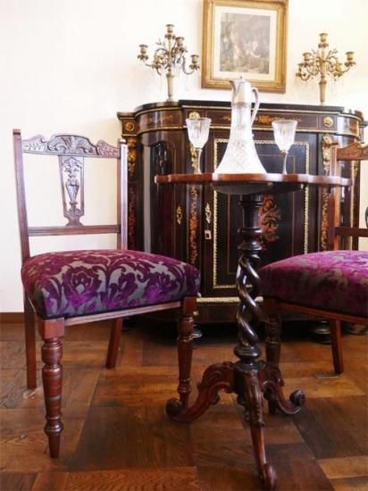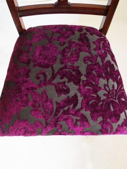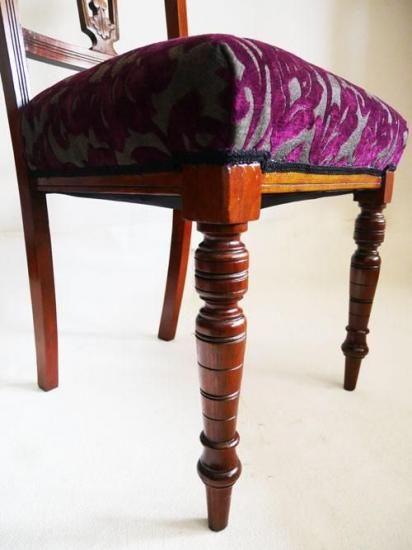 まず、トップレイルは植物をモチーフにしたカーヴィング、そしてバックスプラット(背柱)は透かし彫りで、背もたれ部分はあくまでも軽やか。一方でスクエアな座面はゆったりと広めに作られています。そこには暗めのパープルとダークグレーが格調高い雰囲気をもつ、モール糸が織り込まれた唐草モチーフの輸入ジャガードを張り込みました。前足は挽物細工で、リズミカルな凹凸がふっくらとした座面をしっかりと支えます。