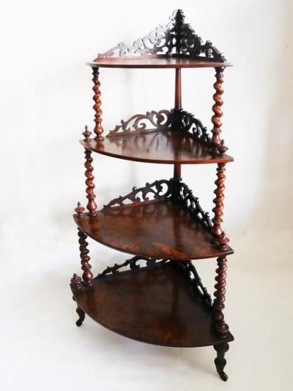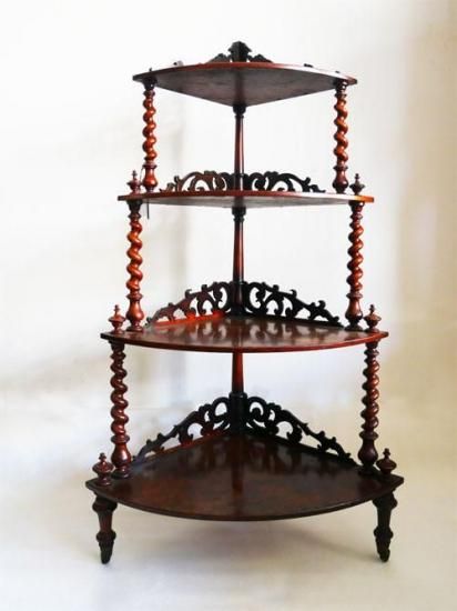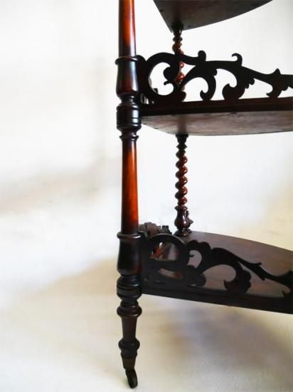 当時の英国家具の装飾様式は17世紀、18世紀に流行したスタイルのリバイバルが主でした。このワットノットも伝統のバーリーツイストの意匠を取り入れたヴィクトリアンらしい装飾性豊かな仕上がりです。