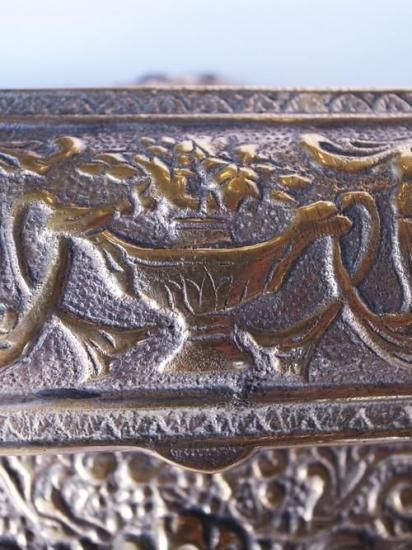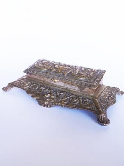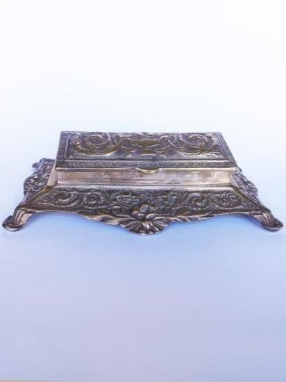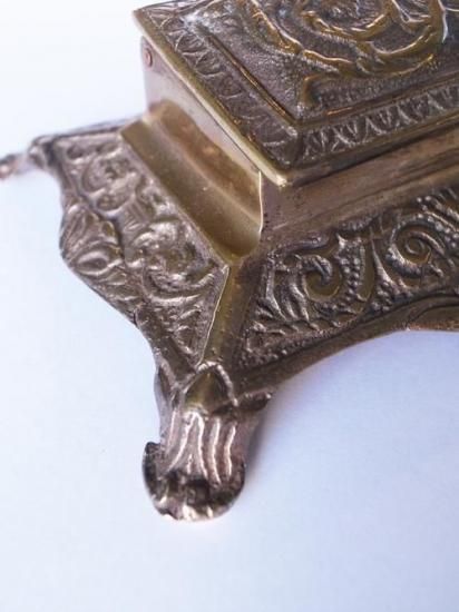 出色は華やかな装飾。蓋には生命の壺を思わせる器に活けられた花々や、左右対称に広がるアカンサスリーフの渦巻文様が施され、全体を優美にまとめています。ベース部分にも同じモチーフが繰り返し使われており、四隅に張り出した脚が全体のポイントでありつつ、安定感も与える役割をもっております。